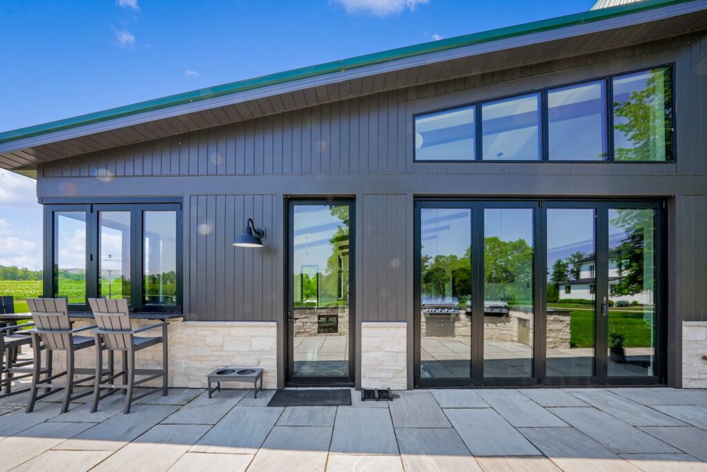 Working alongside an architect, our team helped reimagine part of the existing barn to include a cozy interior complete with a living area, full bathroom, and kitchenette—perfect for guests and gatherings. Large folding windows open up to the outdoor space, creating a seamless connection between the indoors and the expansive patio outside. A custom bar and pass-through counter make serving drinks and food effortless.